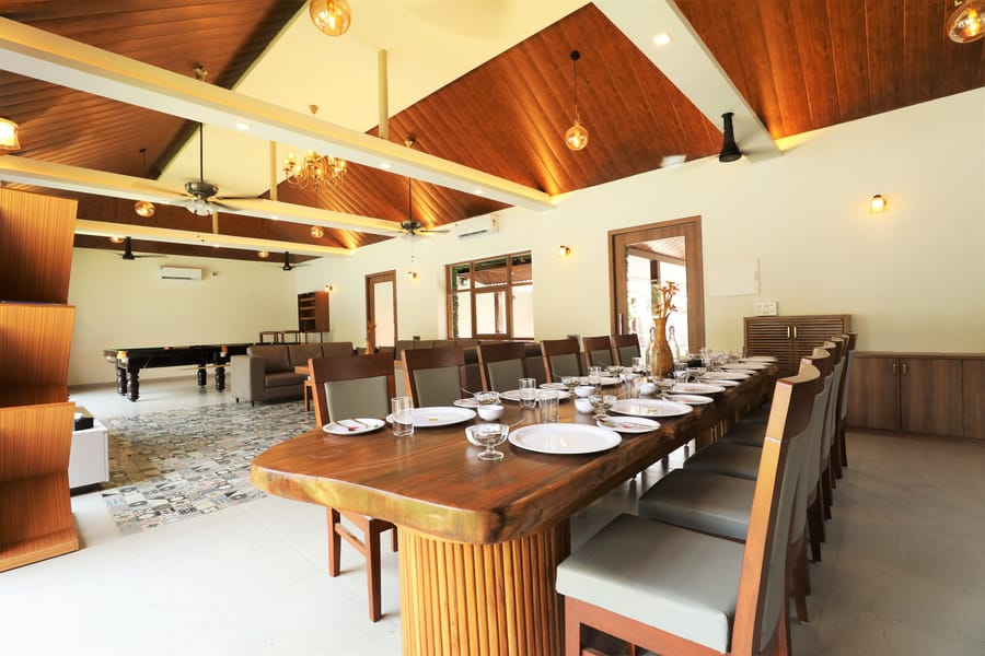 This exclusive staycation spot is all about privacy and comfort. The villa offers all the key amenities to make your holiday stress-free — from daily housekeeping and a caring in-house team to delicious, freshly prepared homemade Konkani meals that give you a true taste of the coast. There’s also a pool table in the living room for your fun evenings indoors and full-time electricity backup to ensure nothing gets in your way. With every little detail taken care of, this place stands out among all private pool villas in Alibaug.