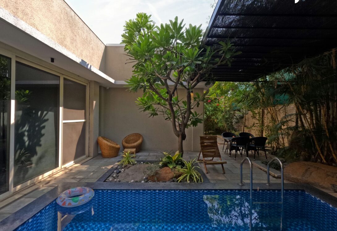 This Luxurious Pet Friendly Villa in Alibaug comes with all the comfort you need — spacious 3BHK layout, air conditioning in all rooms, complimentary high-speed WiFi, and a variety of indoor games. The place also offers curated food packages that suit both local and continental tastes. Whether you want to spend your time binge-watching your favorite shows, playing with your pets, or just enjoying a peaceful nap in the cool breeze, the ambiance supports every mood. The private backyard pool is perfect for a refreshing dip, especially if you prefer your privacy over crowded beaches.