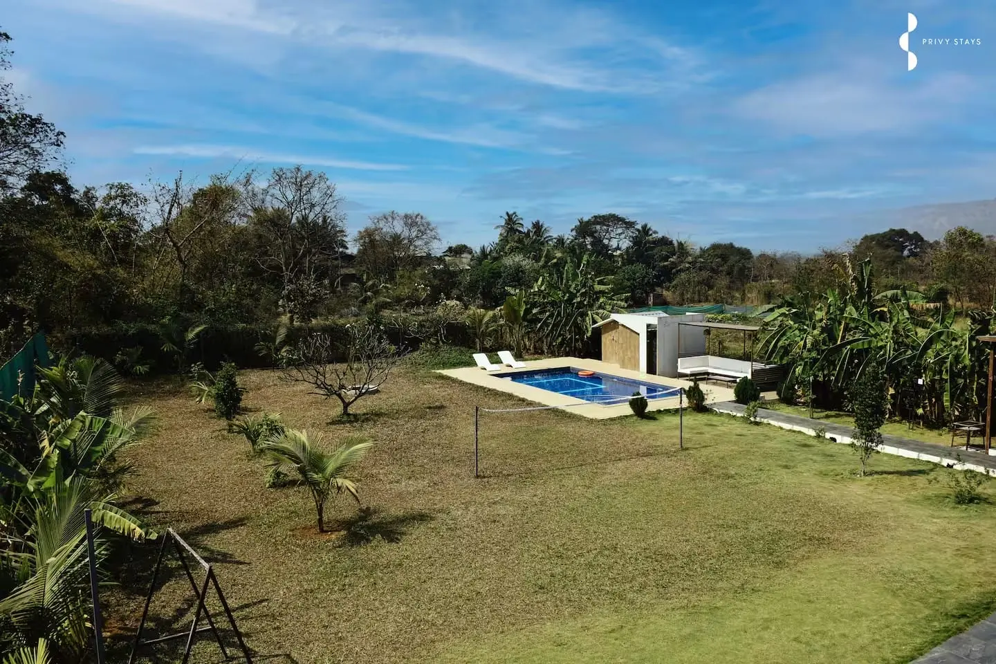 So are you searching for a villa in Alibaug with pool that has a blend of luxury and nature? Escape with the family, friends and pet lovers - Privy Stays Bherse is an ideal retreat. Situated in scenic village of Bherse this villa brings perfection to modern comfort, private swimming and nature beauty for a perfect experience. Unwind, host an intimate gathering or explore Alibaug’s offerings, the villa is crafted to ensure a good time.
